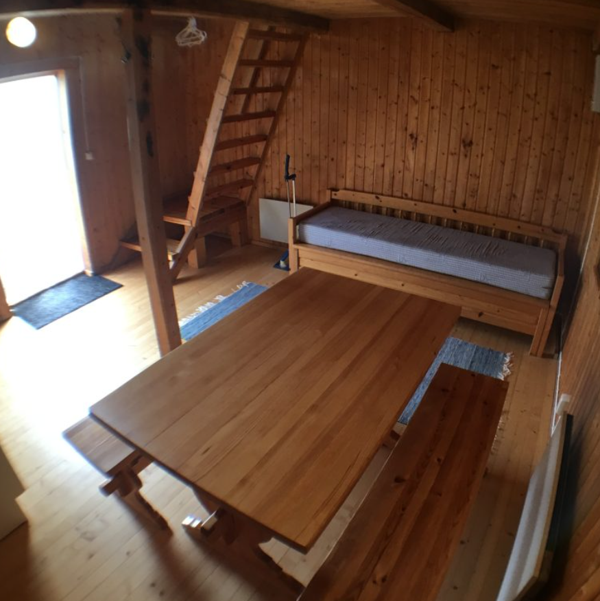 - Alakerrassa pirttipöytä ja vuodesohva.
